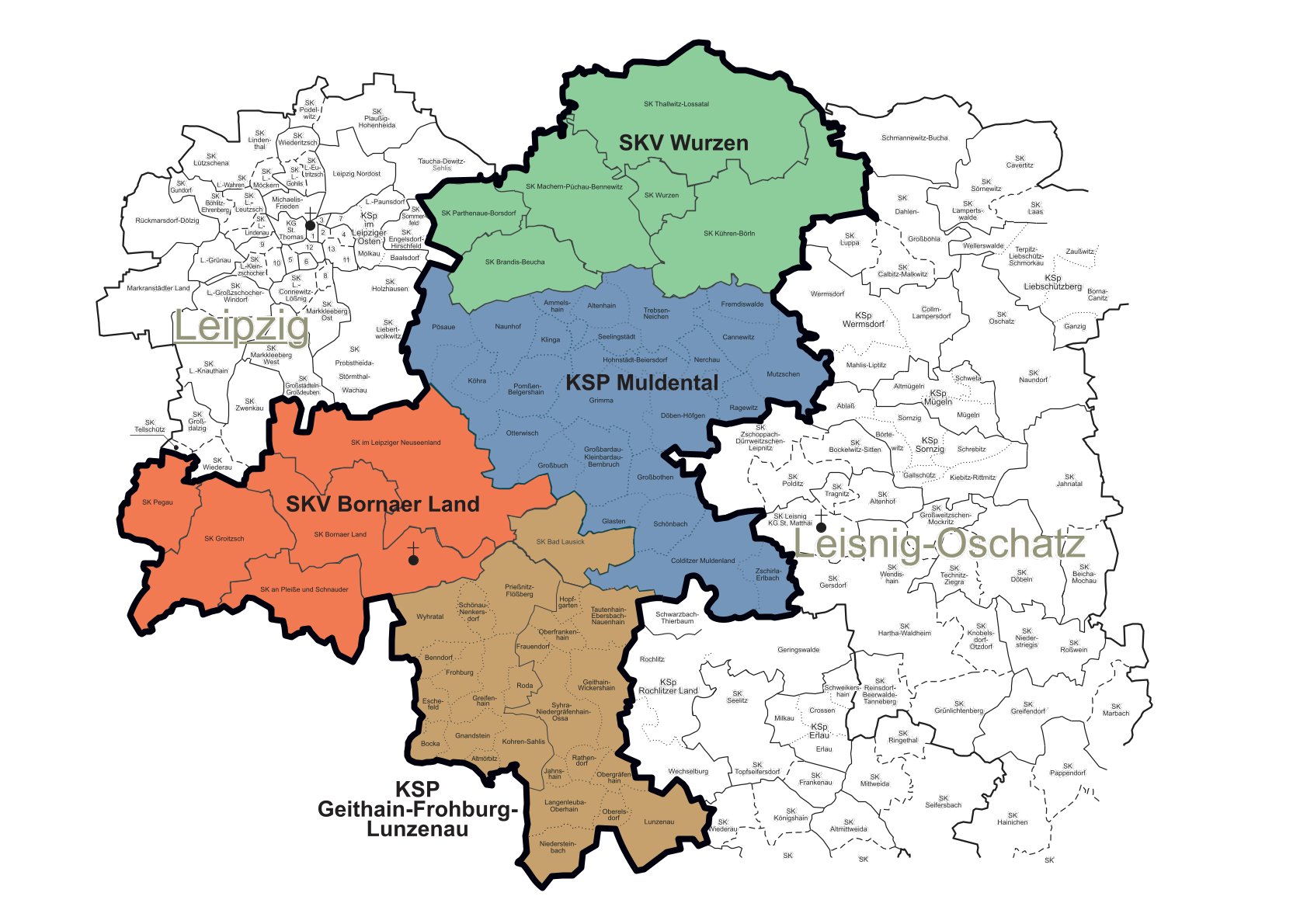 Der Kirchenbezirk Leipziger Land gliedert sich in die vier Region Wurzen, Grimma, Borna und Frohburg/Geithain. Zu ihm gehören 64 Kirchgemeinden, von denen 50 in 3 Kirchspielen zusammengeschlossen sind. Die übrigen 14 Kirchgemeinden haben sich als rechtlich eigenständige Kirchgemeinden in 3 Schwesterkirchverbindungen organisiert.