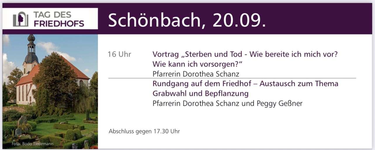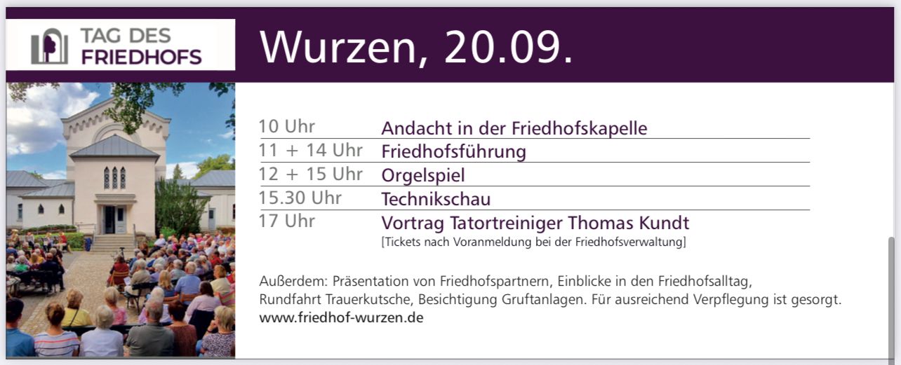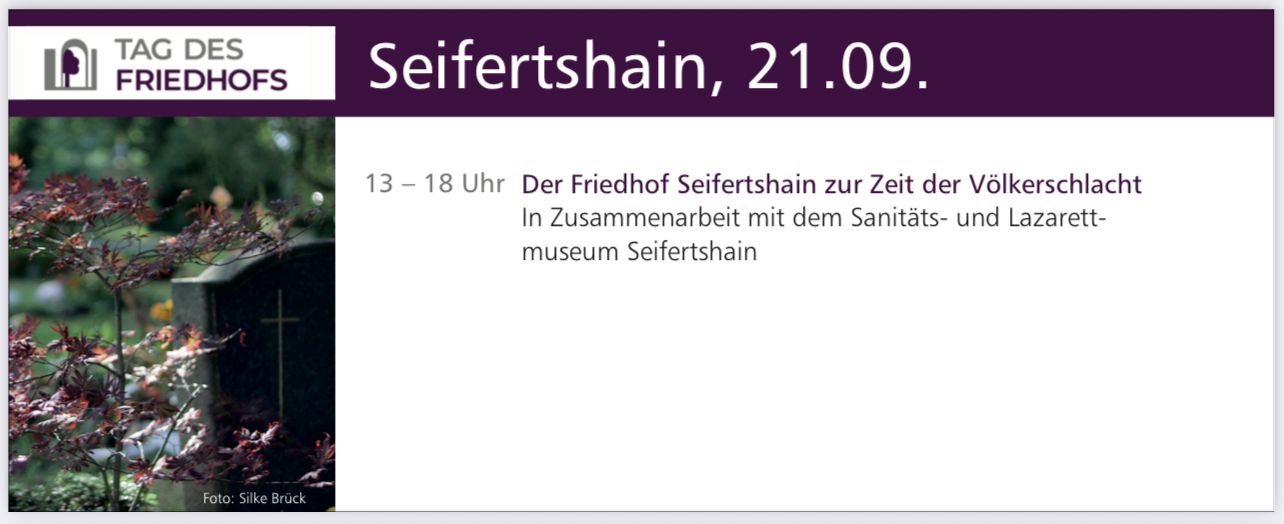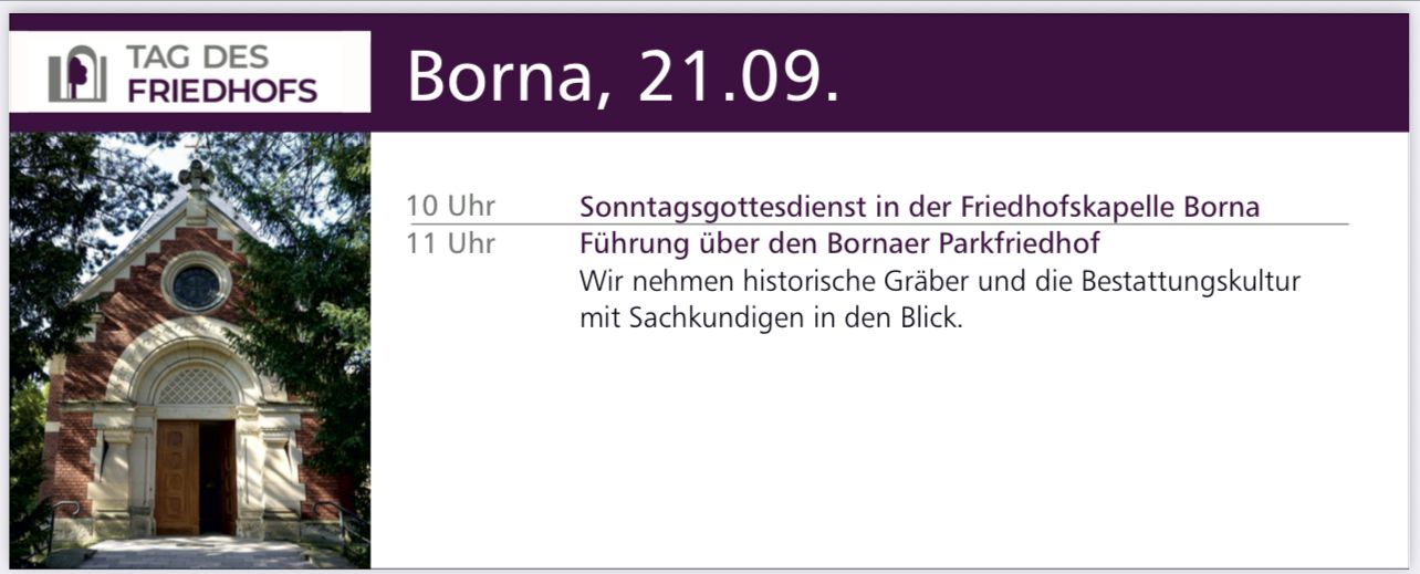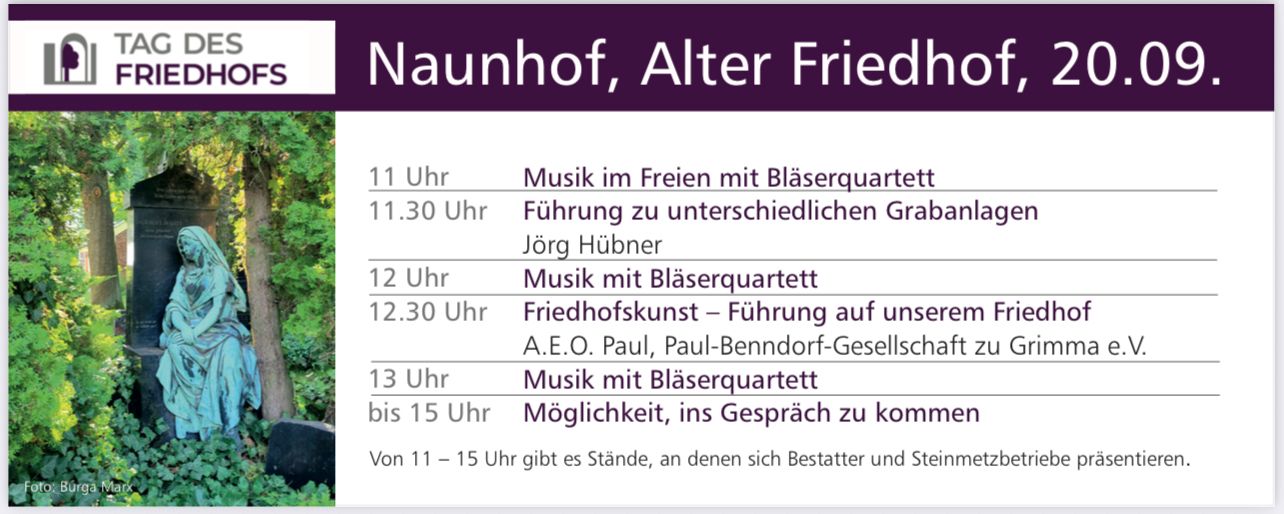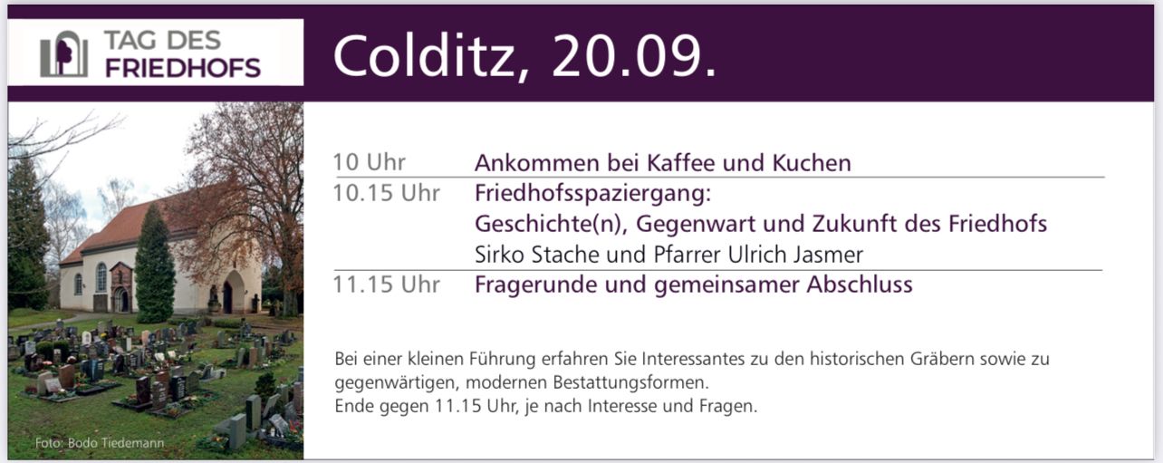 In diesem Jahr werden sich auch Friedhofsträger im Ev.-Luth. Kirchenbezirk Leipziger Land an dieser Aktion beteiligen. Ziel ist es, unsere kirchlichen Friedhöfe in ihren besonderen und wertvollen vielfältigen Funktionen verstärkt in das Blickfeld der Öffentlichkeit zu rücken. Die Friedhöfe sollen vorgestellt und erlebbar werden: