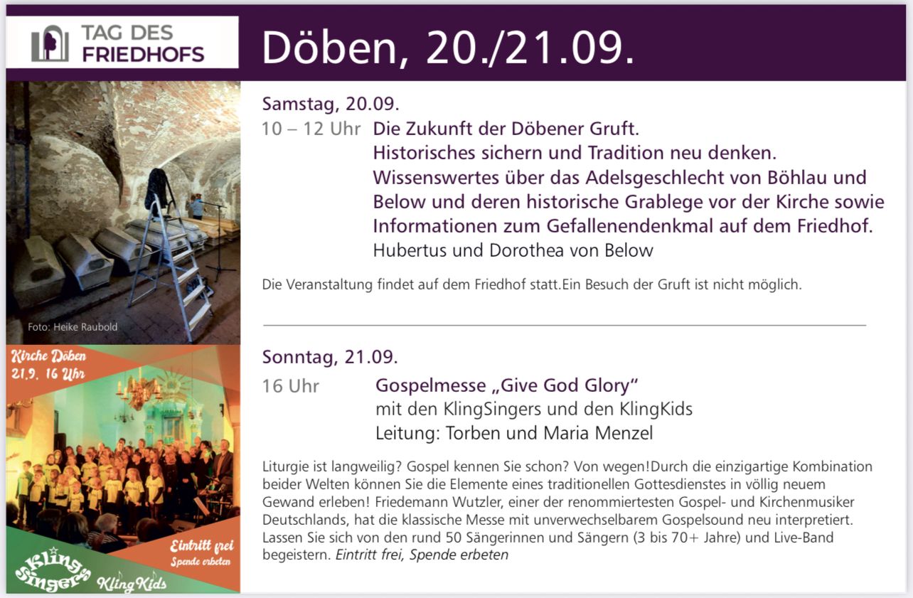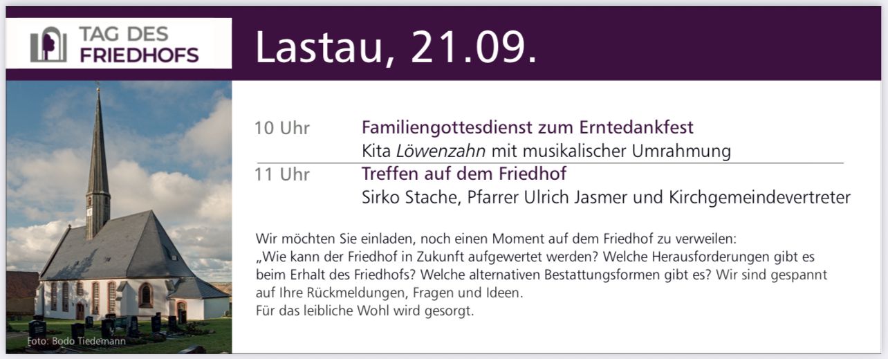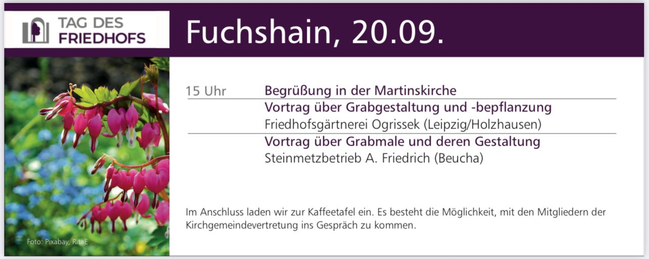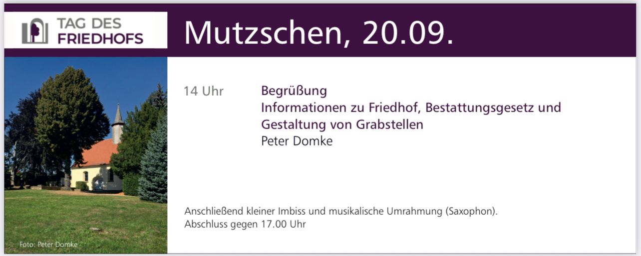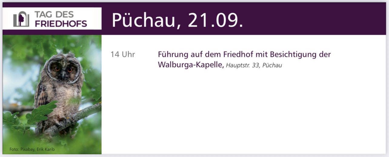 In diesem Jahr werden sich auch Friedhofsträger im Ev.-Luth. Kirchenbezirk Leipziger Land an dieser Aktion beteiligen. Ziel ist es, unsere kirchlichen Friedhöfe in ihren besonderen und wertvollen vielfältigen Funktionen verstärkt in das Blickfeld der Öffentlichkeit zu rücken. Die Friedhöfe sollen vorgestellt und erlebbar werden: